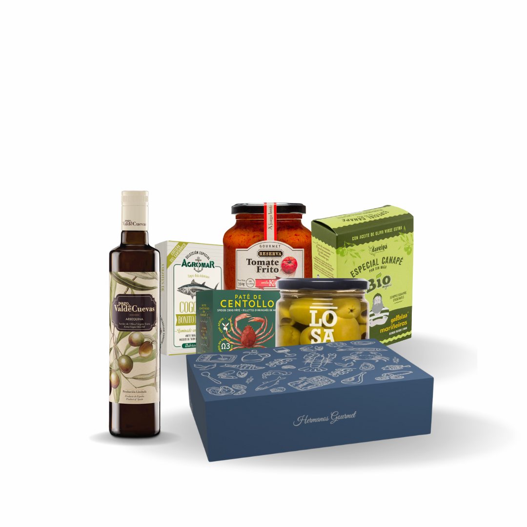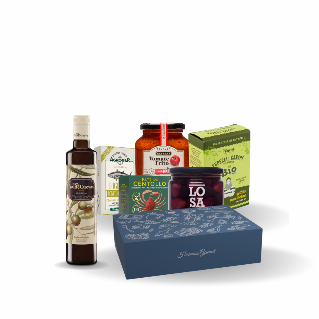 A gourmet gift filled with authentic Spanish delicacies, beautifully wrapped for the holidays.